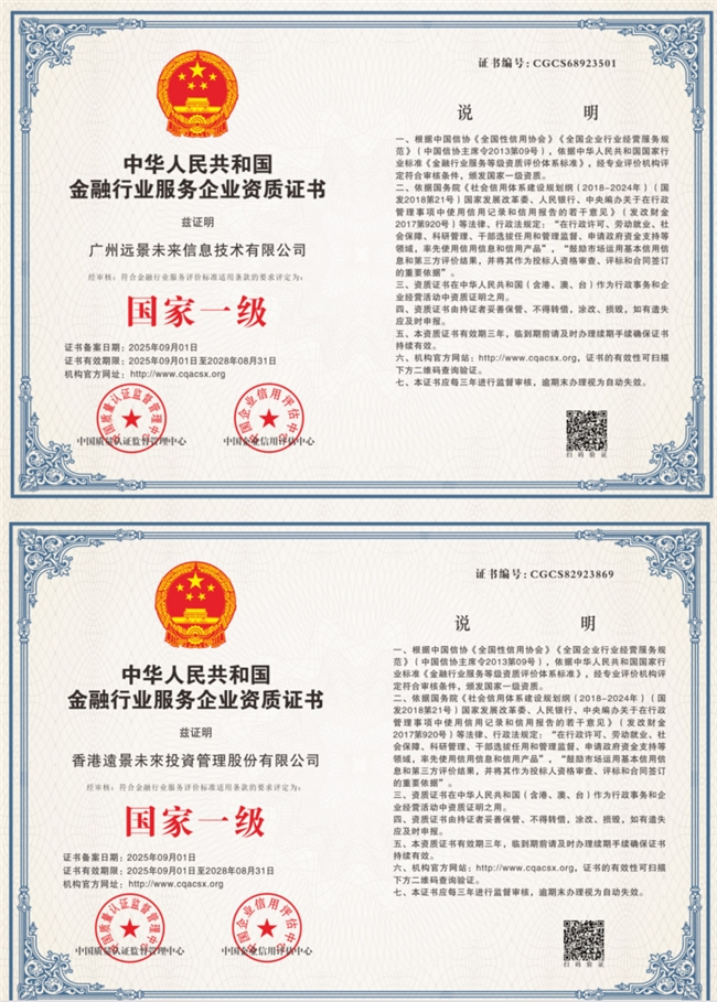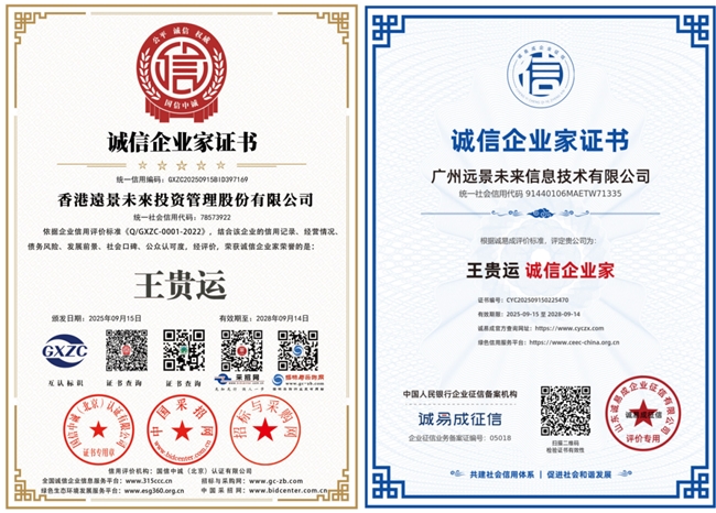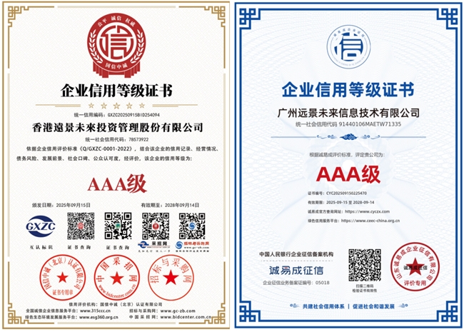 近日★✿◈◈,香港远景未来投资管理股份有限公司及其内地关联企业广东远景未来信息技术有限公司分别荣获国家标准化管理委员会AAA企业信用评价与中国人民银行企业征信系统AAA企业信用评级★✿◈◈。